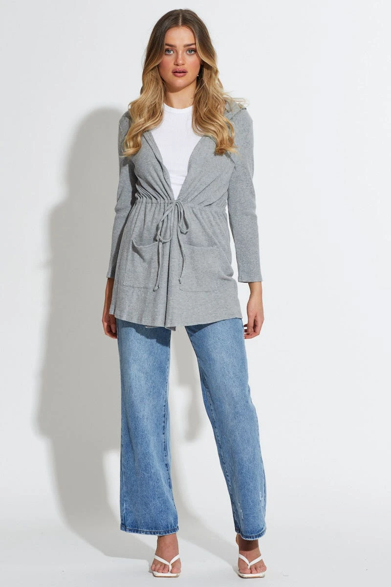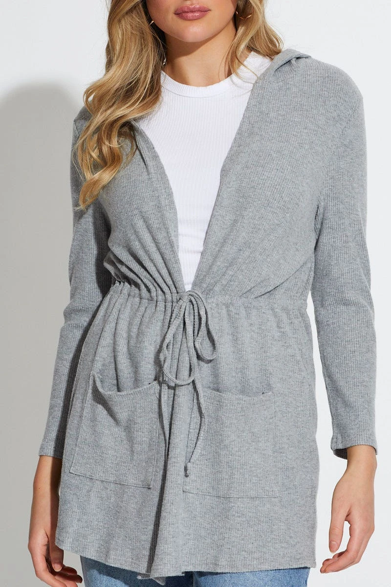 Features: Hooded, Ribbed, Longline, Drawstring Detail