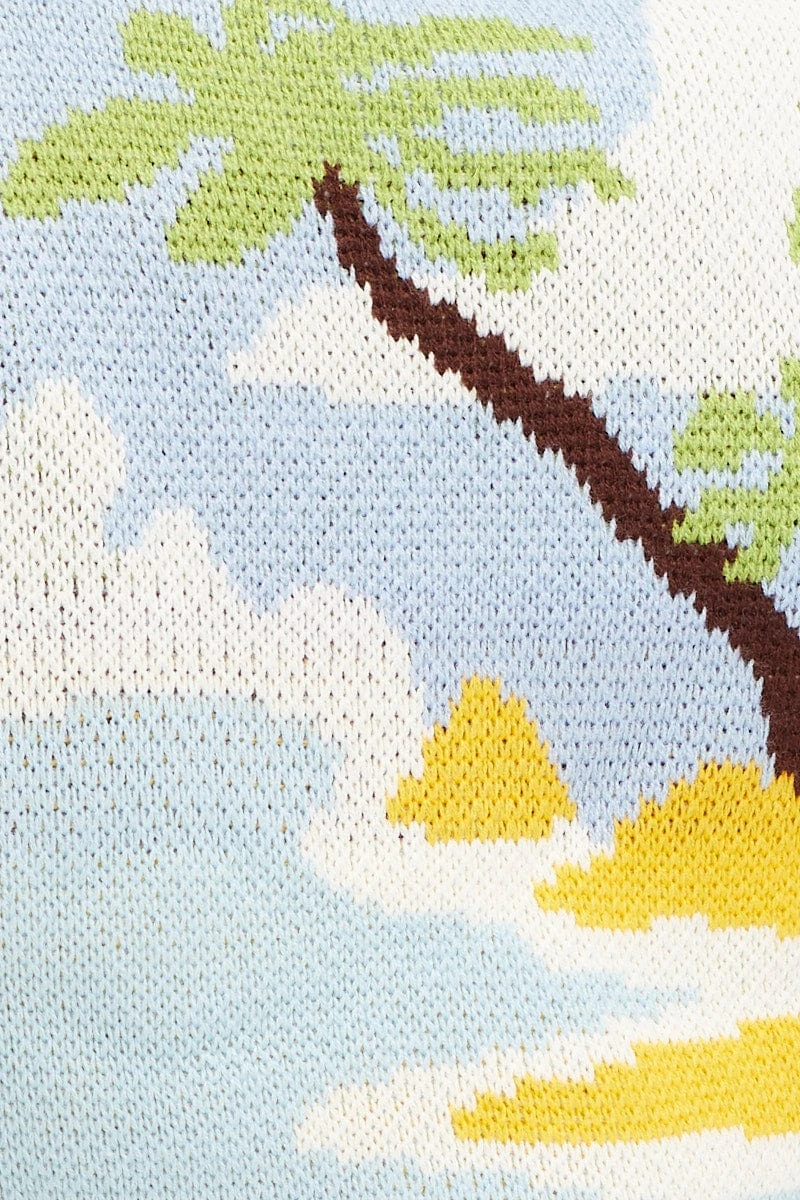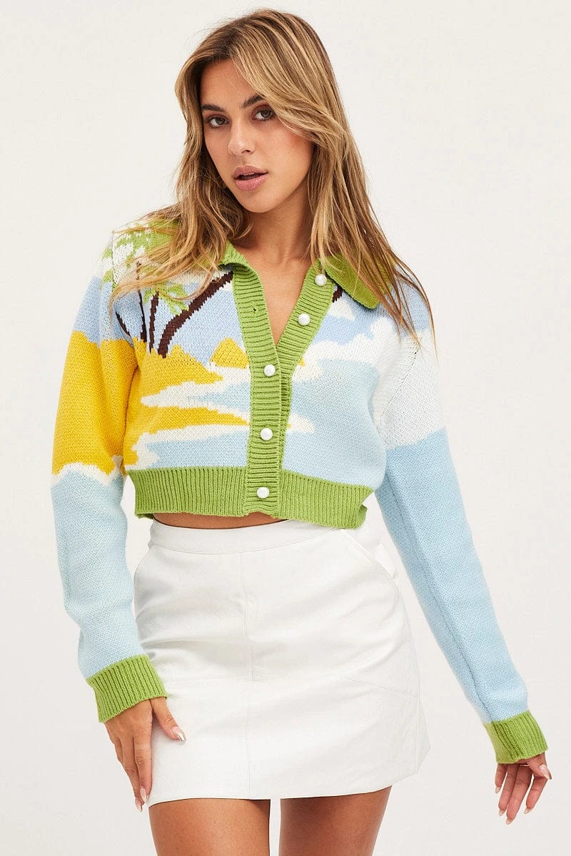 Features: Tropical Design, Knitted Fabric, Button Front, Cropped Length